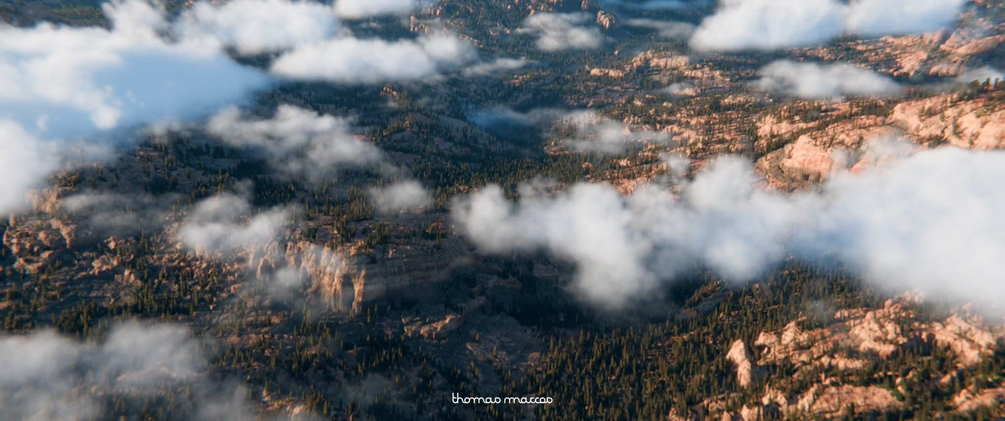 Tested through the preview animations shown on this page, the shader proved efficient in a production-like context. The clouds were rendered in Eevee at three minutes per frame, while the terrain was rendered in Cycles at 30 seconds per frame — a smart hybrid workflow that balances speed and quality.